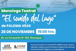 Este 26 de noviembre, en nuestra biblioteca, se llevara a cabo el monólogo teatral el sonido del lago de Paloma Veas, proyecto financiado con Fondos del FNDR, de cultura deporte, seguridad ciudadana y social del gobierno regional del Libertador General Bernardo O¨Higgins y su consejo regional...