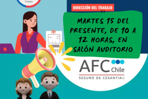 INVITACIÓN Este martes 15 del presente, de 10 a 12 horas, en Salón Auditorio, tendremos una charla informativa donde se contará con la presencia de la Inspección del trabajo y la AFC (Administradora de Fondos de Cesantía) para hablar y explicar sus servicios.Le esperamos para que puedan...