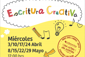 Escribe de manera creativa Fecha: miércoles 3, 10, 17 y 24 de abril / 8, 15, 22 y 29 de mayo Lugar: Centro Lector de Lo Barnechea. Av. Lo Barnechea 1174, esquina Cuatro Vientos.Contacto: centrolector@lobarnecheacultura.cl / 22 754 38 20Horarios: 17:00 hrs. Actividad gratuita.