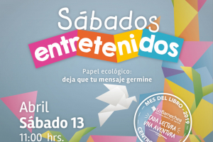 Taller en que realizarán papel ecológico, para escribir un mensaje.¡Ven a disfrutar de un sábado entretenido!Fecha: Sábado 13 de abrilLugar: Centro Lector de Lo Barnechea. Av. Lo Barnechea 1174, esquina Cuatro Vientos.Contacto: centrolector@lobarnecheacultura.cl / 22 754 38 20Horarios: 11...