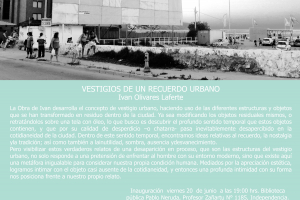 Estimados (as) Los invitamos a la EXPOSICIÓN VESTIGIOS DE UN RECUERDO URBANO Esta muestra de arte gira en torno a espacios urbanos y publicitarios, y a la relación que existe entre éstos y la transformación de objetos a través del tiempo, giran las obras que Iván Olivares...