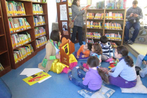 Carla Rojas, integrante del grupo de animaciones Carcajadas Infantilescontando entretenidos cuentos en el auditorio con Carcajadas Infantiles yÁbaco Jardín Infantil San Esteban.