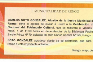 Te invitamos a celebrar junto a nosotros el Dia Nacional del Patrimonio Cultural 2014 .Día y Hora : Viernes 30 de Mayo / 11:00 de la MañanaLugar : Biblioteca Publica de Rengo ( Carlos Condell N°125 , costado Liceo C-15)TE ESPERAMOS.