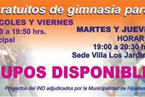 Talleres gratuitos de gimnasia para mujeres, en el Gimnasio Municipal de Hijuelas, los días Lunes, Miércoles y Viernes 18:50 a 19:50 hrs. , y en la Sede Villa Los Jardines. los días Martes y Jueves de 19:00 a 20:30 hrs.