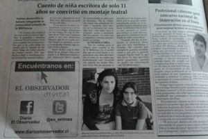 El día Vierenes 4 de Abril del presente año, en la página 26 del periódico el Observador, se hizo un reportajae a nuestra sociaNicolle Cancino Urra, quien cursa el sexto básico en el Colegio Antumapu de nuestra comuna, destacando su amor por las letras ya que fue ella quien creó la...