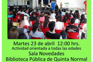 Les invitamos a la Ceremonia de Celebración del Día del Libro, actividad orientada a todas las edades, que realizaremos mañana martes 23 de abril a las 12:00 hrs. en Sala Novedades de Biblioteca Pública de Quinta Normal, Radal 1693, esquina Padre Tadeo. Comuna de Quinta Normal. Entrada...
