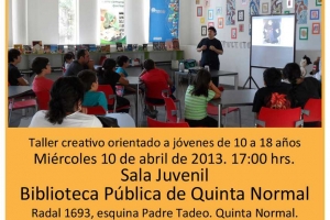 El miércoles 10 de abril de 2013 a las 17:00 hrs. realizaremos en Sala Juvenil de Biblioteca Pública de Quinta Normal un Taller de Cuentos Ilustrados, se trata de una actividad creativa orientada a jóvenes de 10 a 18 años que es parte de nuestra celebración del "Mes del Libro y la Lectura"....