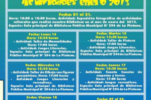 Como todos los años y este no es la acepción la Biblioteca Municipal de La Pintana, se complace en invitar a todos sus usuarios y aquellos quieres pasarlo bien aprendiendo y disfrutando de una serie de actividades que tenemos preparadas especialmente para ustedes. Desde el 14 al 18 de Enero...