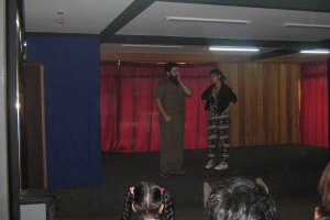 Con gran afluencia de público, que disfruto y participo de la obra El hombre que se convirtió en perro presentada en el salón de la Biblioteca Pública Municipal.