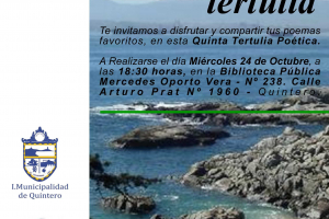 Para el miércoles 24 de Octubre está programada la Quinta Tertulia Poética en nuestra biblioteca, los invitamos a disfrutar de poemas inéditos, escritos por vecinos de la comuna. Esperamos tu asistencia, la cual dará realce a nuestro evento.