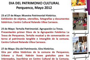 DÍA DEL PATRIMONIO CULTURAL: Perquenco, Mayo 2012. 23 al 27 de Mayo: Muestra Patrimonial Histórica. Exhibición de objetos, utensilios, fotografías y documentos históricos. Centro Cultural Rolando Ulloa Carrasco.25 de Mayo: Tertulia Patrimonial. Agrupación La Trova. Presentación...