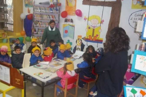 Escuchando un cuento, relatado por la señora Marissa Millapel,