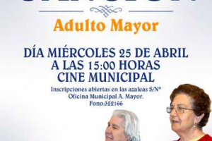El día Miércoles 25 de se realizará el Festival de la Canción del Adulto Mayor, las personas interesadas pueden inscribirse en las Oficinas del Adulto Mayor ubicadas en Las Azaleas s/n o al telefono: 322166.
