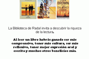 Con la campaña "Léete un Libro" la Biblioteca de Radal ha incentivado a los usuarios a llevarse un libro y leerlo. La idea es fomentar a través de afiches la lectura en la comunidad y que esta aproveche el rico material bibliográfico con que cuenta la Biblioteca de Radal.