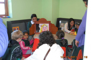La Tía del Jardín Infantil disfruto del hermoso material llegado a nuestra Biblioteca hace algunas semanas, hablo del Kamishibai entretenido teatro de papel que muestra con hermosas fotografias una histroria, la cual la profesora relato a sus pequeñines.-