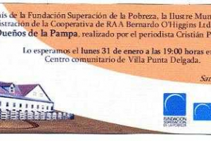 Hoy Lunes 31 de Enero a contar de las 19:00 horas en el Centro Comunitario de Villa Punta Delgada, Comuna San Gregorio, se realizará el estreno del documental denominado "DUEÑOS DE LA PAMPA" Invitan: Programa Servicio País de la Fundación Superación de la Pobreza, Ilustre Municipalidad de San...