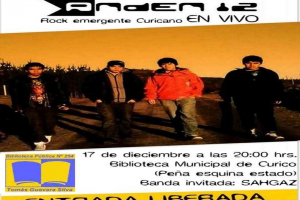 Este viernes 17 de Diciembre a partir de las 20:00 horas, se presentará en la Biblioteca Municipal de Curicó Tomás Guevara Silva la banda de rock Andén 12 junto a la banda telonera Sahgaz y otras bandas curicanas. La actividad musical contempla entrada gratuita y se invita a todos...