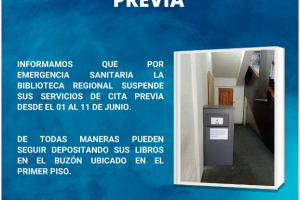 Informamos que por emergencia sanitaria la Biblioteca Regional suspende sus servicios de cita previa desde el 01 al 11 de junio.De todas maneras, pueden seguir depositando sus libros en el buzón ubicado en el primer piso.