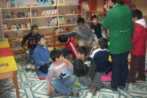 Francisca Mardones: funcionaria de la Bibliteca y niños de la comunidda