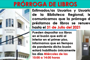 Estimados/as Usuarios y Usuarias de la Biblioteca Regional, les comunicamos que la prórroga de préstamos de libros se renueva hasta el 31 de Julio del 2021.Pueden depositar sus libros en el buzón que está al interior en el primer piso, informamos que en tiempos de pandemia dicho buzón estará...