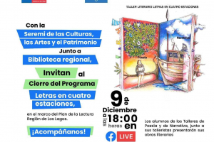 Los dejamos cordialmente invitados al cierre del Programa Letras en cuatro estaciones, que se va a realizar este miércoles 09 de diciembre a partir de las 18:00 horas, acompáñanos a través de Facebook Live de la Biblioteca Regional de los Lagos.Los Alumnos de los talleres de poesía y de narrativa...