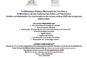 Ministerio de las Culturas, las Artes y el Patrimonio, a través del Servicio Nacional del Patrimonio Cultural, a partir del 14 de septiembre, estarán abiertas las inscripciones para la oferta 2020 del programa de capacitación a distancia del Programa BiblioRedes.Capacitaciones a las que podrán...