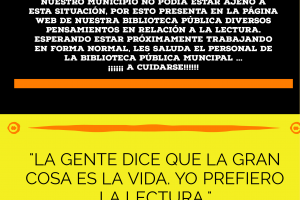Estimados usuarios: los libros en préstamo, una vez pasada esta situación, pueden ser devueltos. Así evitamos la propagación del virus y colaboramos con las recomendaciones sanitarias. Se cuidan ustedes,nos cuidamos nosotros;nos cuidamos todos. Para consultas, nuestro...
