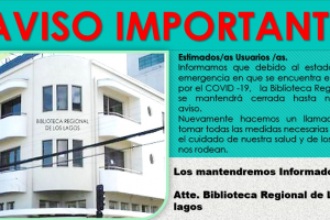 Estimados/as Usuarios /as.Informamos que debido al estado de emergencia en que se encuentra el país por el COVID -19 la Biblioteca Regional se mantendrá cerrada hasta nuevo aviso.Nuevamente hacemos un llamado a tomar todas las medidas necesarias para el cuidado de nuestra salud y de los que...
