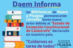 Informamos que por la emergencia sanitaria nacional que vive el pais y el planeta, la Biblioteca se encontrará cerrada hasta nuevo aviso.Puede solicitar prestamos en linea de libros digitales en www.bpdigital.cl como tambien estar al tanto de cursos e-learning en www.biblioredes.cl