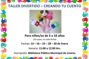 TALLER DIVERTIDO – CREANDO TU CUENTO-Biblioteca Pública Municipal de Linares- ¿Te gustan los cuentos?, ¿Te gustaría crear uno?Niños(as) de 5 a 10 añosLos días 14 – 16 – 23 – 28 – 30 de enero…10 cupos en cada fecha-Desde las 11:00 a 12:00 horas- Ven a la Biblioteca - ¡Anímate y...