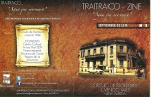En el Centro Cultural de esta comuna se realizó el lanzamiento de la segunda edicion de ZINE imperialino que lleva por nombre TRAITRAICO - agua que murmura junto a la Tertulia Literaria de Primavera organizada por el Circulo de Escritores Juvencio Valle y auspiciada por la Ilustre Municipalidad; actividad enmarcada en el programa de Fiestas Patrias. Esta velada cultural inundada de versos contó con la participación de artistas de las letras de la Nva. Imperial, Pucòn, Temuco y Carahue. Cada uno de los exponentes dio lectura a sus obras literarias.