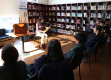 La narradora de la casa Edith Chanqueo, preparó ambas actividades quee deleitaron a los escolares presentes. El cuento fue La Caimana, basado en una historia real. El kamishibai fue La orilla del río.