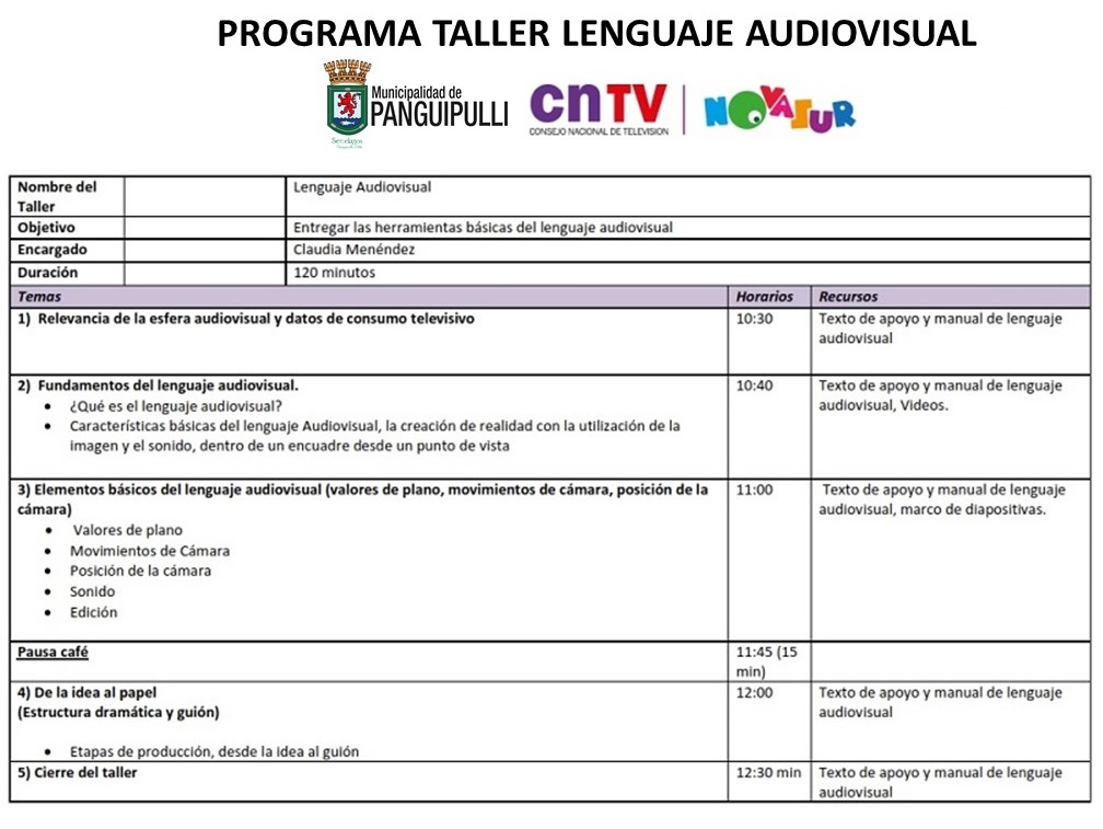 El Departamento de Cultura de la Municipalidad de Panguipulli y el Consejo Nacional de Televisión, a través de su Departamento de Televisión Cultural y Educativa Novasur, invitan a profesores, audiovisualistas y estudiantes, a participar en el Taller de Lenguaje Audiovisual.