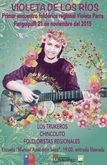 Sábado 21 de Noviembre. 19:00Escuela Manuel Anabalón Sáez.Entrada Liberada.Violeta de los Ríos es el nombre del Primer Encuentro Regional Folclórico, en torno a la figura de Violeta Parra en la región, y se realizará en el Sábado 21 de Noviembre a las 19:00 horas en la Escuela Manuel Anabalón...