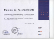 Reconocimientoento a la Biblioteca por el trabajo cotidiano y al esfuerzo  que se realiza en pro del cumplimiento de indicadores del Programa Biblioredes, que es el Sitema deNacional de Bibliotecas Públicas la la que la destaca a nivel Nacional con la entrega de un Certificado. El evento fue encabezado por el director de la DIBAM, Ángel Cabeza, y el Subdirector del SNBP, Gonzalo Oyarzún y Alberto Gil Lajaña, Coordinador Nacional del Programa Biblioredes.