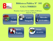 Cada taller esta destinado para jóvenes entre 10 y 20 años. El objetivo principal de estas actividades, es atraer jóvenes a la bibliotecas. utlizando estrategias artísticas, lectoras para ese fin.Convocando a Escuelas, liceos y Jovenes de la comunidad a particiapar de los talleres ...