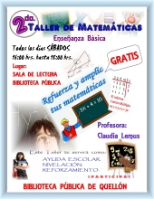 La Biblioteca Pública de Quellón, tiene el agrado de INVITAR a todos los niños de Enseñanza Básica de la comuna, que deseen nivelar, reforzar o sencillamente estudiar las matemáticas, al SEGUNDO TALLER DE MATEMÁTICAS, que se realizarán a partir del Sábado, 27 de octubre y sucesivamente todos los sábados a partir de las 16;00 hrs., y finalizando cerca de las 18;00 hrs. En su NUEVO HORARIO.