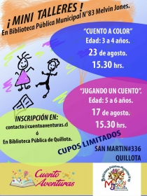 Durante agosto tendremos dos talleres para los más pequeños 17 de agosto "Jugando un cuento": con este taller niños y niñas ingresan al mundo de los cuentos vivenciándolos, se estimula la imaginación, los sentidos auditivos y tacto, así como también el despertar de las emociones, generando una...