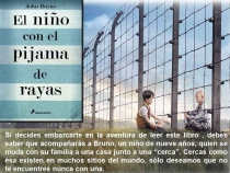 El niño con el pijama de rayas , novela de John Boyne. Bruno no acaba de comprender quiénes son y qué hacen todas aquellas personas que visten el mismo pijama de rayas y que parecen tan tristes. Se hace amigo de uno de los niños del campo. Una mirada desde la inocencia de un niño sobre el...
