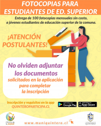 La Oficina de la Juventud realiza un llamado a renovar o postular al “Programa de Ayuda Para Estudiantes de Educación Superior” que entrega 100 fotocopias mensuales sin costo.El principal requisito es contar con un Certificado de Matrícula 2022 o el Certificado de Alumno Regular y realizar el...