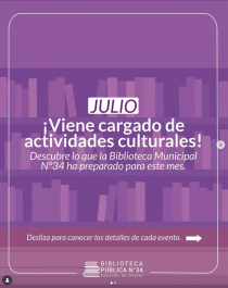 ¡Julio llega cargado de cultura en la Biblioteca Municipal #34!Durante este mes, te invitamos a ser parte de actividades abiertas a todo público, pensadas para fomentar la lectura, la poesía y el acceso a espacios renovados. Conversatorio formativo: “Práctica poética: cómo trabajarla en...