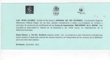 El martes 18 de Diciembre a las 19:00 horas con la presencia de la Primera Autoridad Comunal, Don Luis Reyes Alvarez y la Coordinadora Regional de Bibliotecas Yohanna del Río, se procederá a certificar a nuestros usuarios infohabilitados durante el año 2012.
