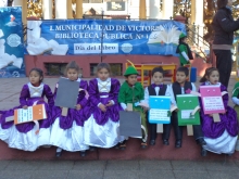 Y fue una hermosa celebración…la música de batucada del Colegio Instituto de Victoria, irrumpió fuerte y alegre, alterando la tranquilidad en las calles céntricas de Victoria, presidiendo el desfile de personajes de la literatura universal del día martes 26 de abril en que realizamos ya por quinto año consecutivo nuestro desfile-Pasacalles, con usuarios y alumnos caracterizados como personajes de literatura, todo ello organizado por la Biblioteca Pública Municipal N°116, Marta Brunet y la Red de Bibliotecas Escolares C.R.A., sorprendiendo una vez más a la ciudadanía con este singular pasacalles para conmemorar el Día del Libro y del Derecho de Autor. La actividad tuvo lugar a las 11:00 hrs, en la Plaza  Balmaceda de Victoria, en la que se montó un lindo escenario bajo el odeón, simulando un rincón infantil preparado por las funcionarias de la Biblioteca Pública. Todos los participantes recorrieron el centro comercial  de nuestra ciudad para luego llevar a cabo el acto central en el centro de  la plaza. En esta oportunidad también se realizó la premiación de los mejores lectores del año 2015, de cada Biblioteca C.R.A participante y de la Biblioteca Pública quién destacó a sus tres mejores lectores de distinto nivel etario.