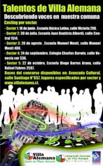 La Municipalidad y la Corporación Municipal de la comuna, organizó el Concurso TALENTOS PARA VILLA ALEMANA cuyo objetivo es desarrollar las actividades culturales comunales y acercarlas a los diferentes sectores de la ciudad.