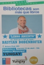 El próximo viernes 12 de abril, contaremos con la visita de Bastián Bodenhofer en otra de las actividades de extensión cultural denominada "Libro Abierto" Una charla que es todo un cuento. A partir de las 19:00 horas en nuestra biblioteca, esperando a nuestros usuarios y público en general con la misma cordialidad y amabilidad de siempre.