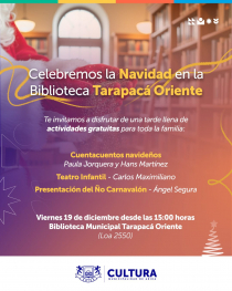 La Biblioteca Municipal Tarapacá Oriente invita cordialmente a la comunidad a participar de una Actividad Navideña Familiar, este viernes 15 de diciembre, a partir de las 15:00 horas. te esperamos . cual duda llamar al fono 432380362