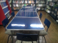 Hermosamente quedaron nuestra mesas y estanterías, después de pintarlas de un hermoso color azul....Invitamos a todos nuestros usuarios a conocerlas...