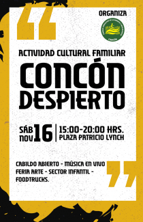 CONCÓN DESPIERTO SÁBADO 16 DE NOV 15 HORAS.- PLAZA PATRICIO LYNCHEl Consejo Consultivo de la Infancia y Adolescencia de Concón con apoyo del Municipio local está organizando la actividad denominada:”Concón Despierto”, la que se realizará el sábado 16 de Noviembre de 15 a 20 horas en la Plaza...