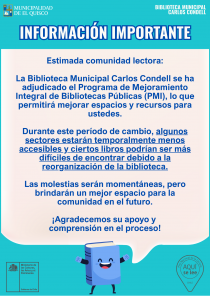 a Biblioteca Municipal Carlos Condell se ha adjudicado el Programa de Mejoramiento Integral de Bibliotecas Públicas (PMI), un importante reconocimiento que permitirá fortalecer sus espacios, servicios y recursos en beneficio de la comunidad. Gracias a este programa, la biblioteca iniciará un...