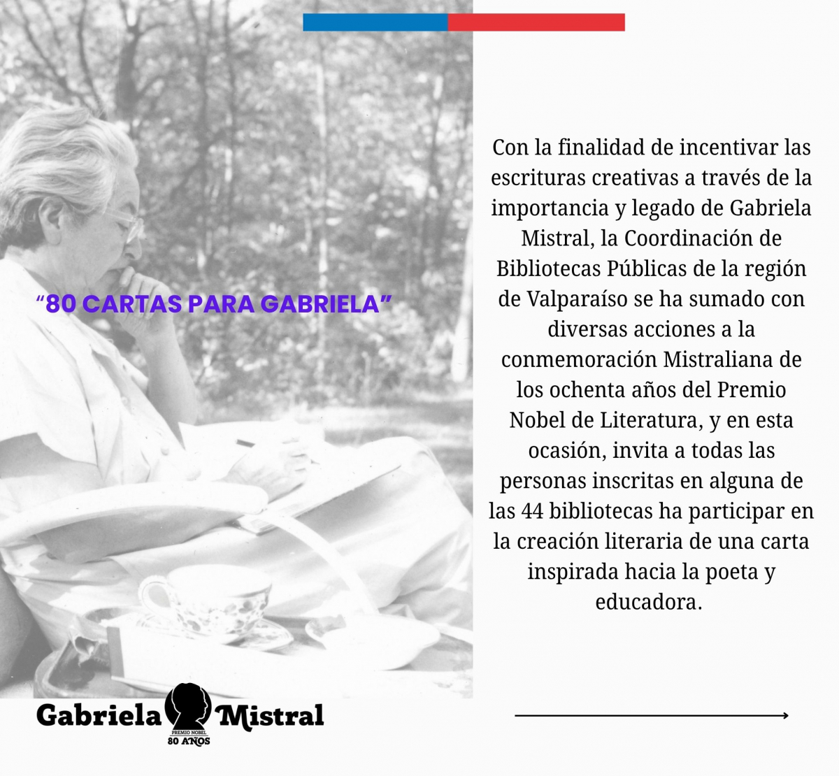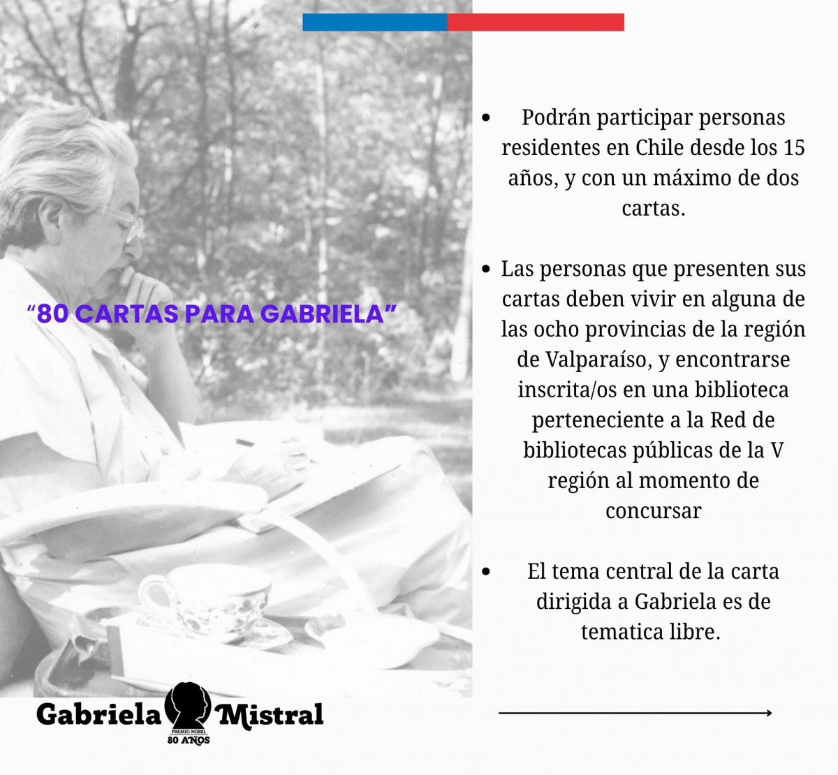 "La invitación es simple pero profunda: escribir una carta dirigida a Gabriela Mistral. Un texto que puede nacer desde la emoción, la reflexión, el agradecimiento, la memoria, la crítica o la simple curiosidad. Cartas que dialoguen con la mujer, la maestra, la viajera, la poeta, la pensadora. Cartas que abracen su legado desde la vida cotidiana, la intimidad o la imaginación."